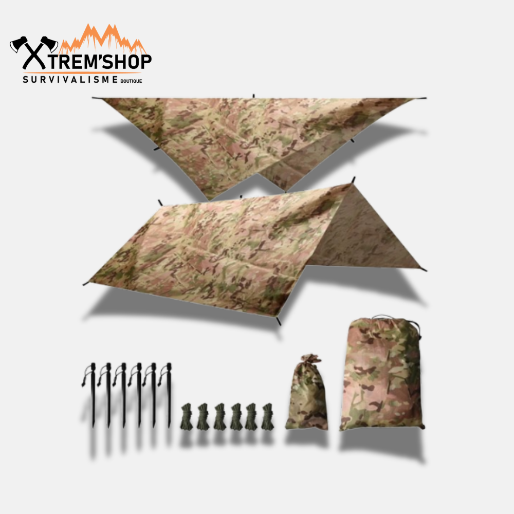 Voici l'abri de survie camouflage ! Cet abri résistant et durable est parfait pour ceux qui veulent être prêts à tout. Fabriqué en matériau imperméable avec une résistance de 3000 mm, il vous gardera au sec et à l'aise même dans les conditions les plus difficiles. De plus, son design camouflage vous aidera à vous fondre dans votre environnement.