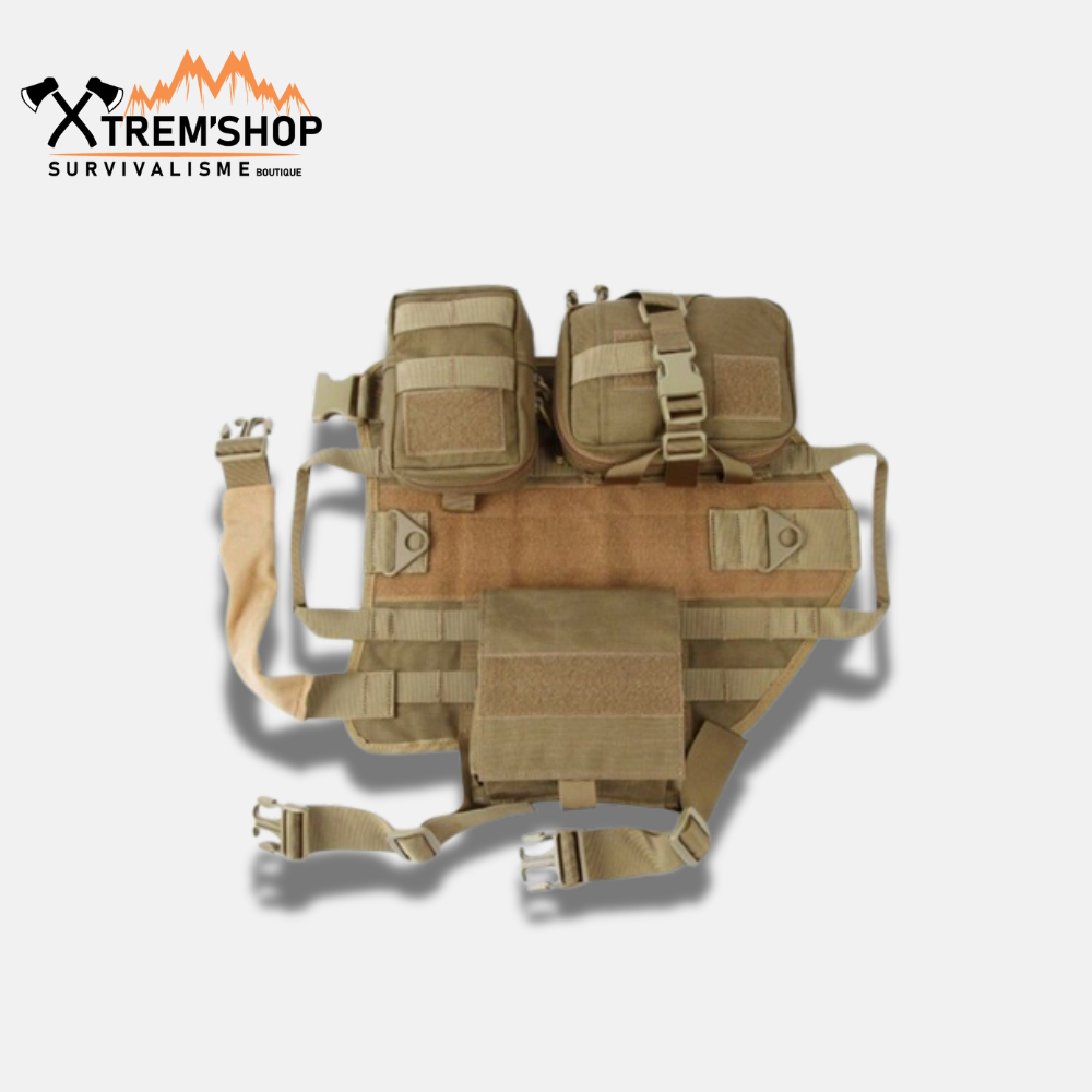 • Système MOLLE et Poches Additionnelles : Equipé de sangles MOLLE, ce harnais permet d'ajouter des accessoires comme des pochettes, des paniers d'eau et bien plus encore, pour rendre vos sorties encore plus pratiques.